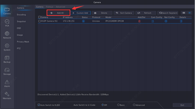 C. Click 【Custom Add】. In the pop-up window as displayed below, enter the IP address and complete other settings, and then click Add. You may also click Search Segment and add discovered cameras in the list.