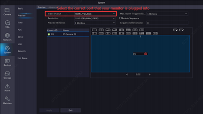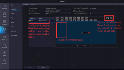 Step 3. Click window 1 on the right, and then click D1 under Camera on the left. Now D1 appears in window 1. Click Apply to save the settings