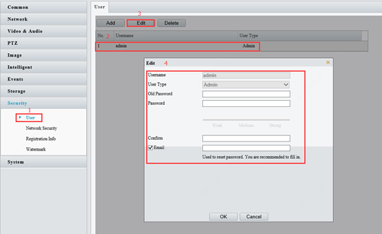 Log into the web interface of the camera, go to 【Setup】>【Security】>【User】, click on and select admin user (the admin user row will turn gray when selecting), click on ‘Edit’. Then a new window will pop up and you can input the old and new password, then click on ‘OK’.