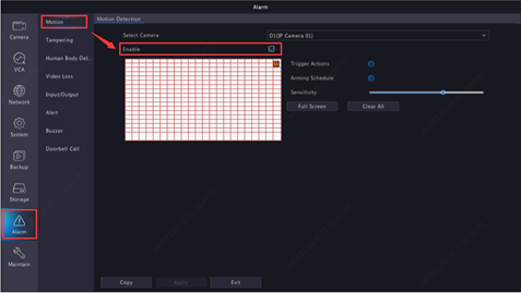 Step 1. Click 【Alarm】>【Motion】, enable motion detection. Select the desired camera and tick Enable. Use the mouse to draw a detection area, and drag the slider to set detection sensitivity, target object size, and duration. The higher the sensitivity, the more likely a moving object will be detected.