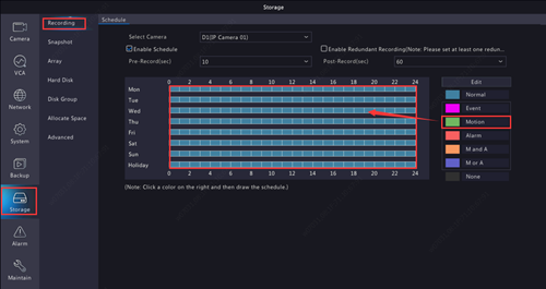 Step 3. Set up recording schedule. Go to 【Storage】>【Recording】, select camera, enable schedule, click on the green box on the right side, then drag the mouse to draw the schedule all the way from left to right.