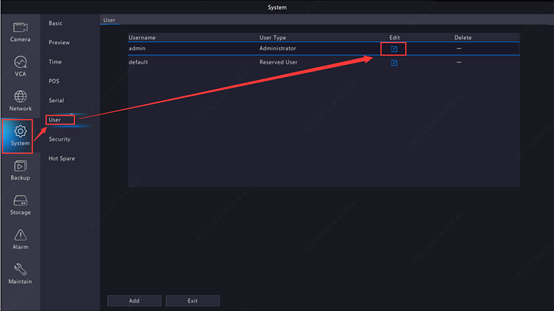 Log into the NVR on the monitor, go to 【System】>【User】,click on the ‘Edit’ icon on the admin user row, input the login password. And then on the pop-up window, you will see an option named ‘Enable Unlock Pattern’, please untick it and click on ‘OK’.