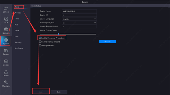 Log into your NVR on the Monitor, go to【System】>【Basic】>【Basic Setup】, untick ‘Enable Password Protection’ and click on ‘Apply’, and the login password will be disabled.